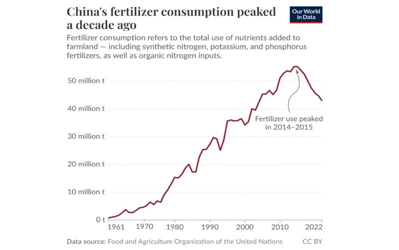 China's population has doubled, yet per capita grain output has risen. Fertilizer use peaked in 2014 and then declined due to the "Zero-Growth" policy, achieving higher yields with reduced application.
